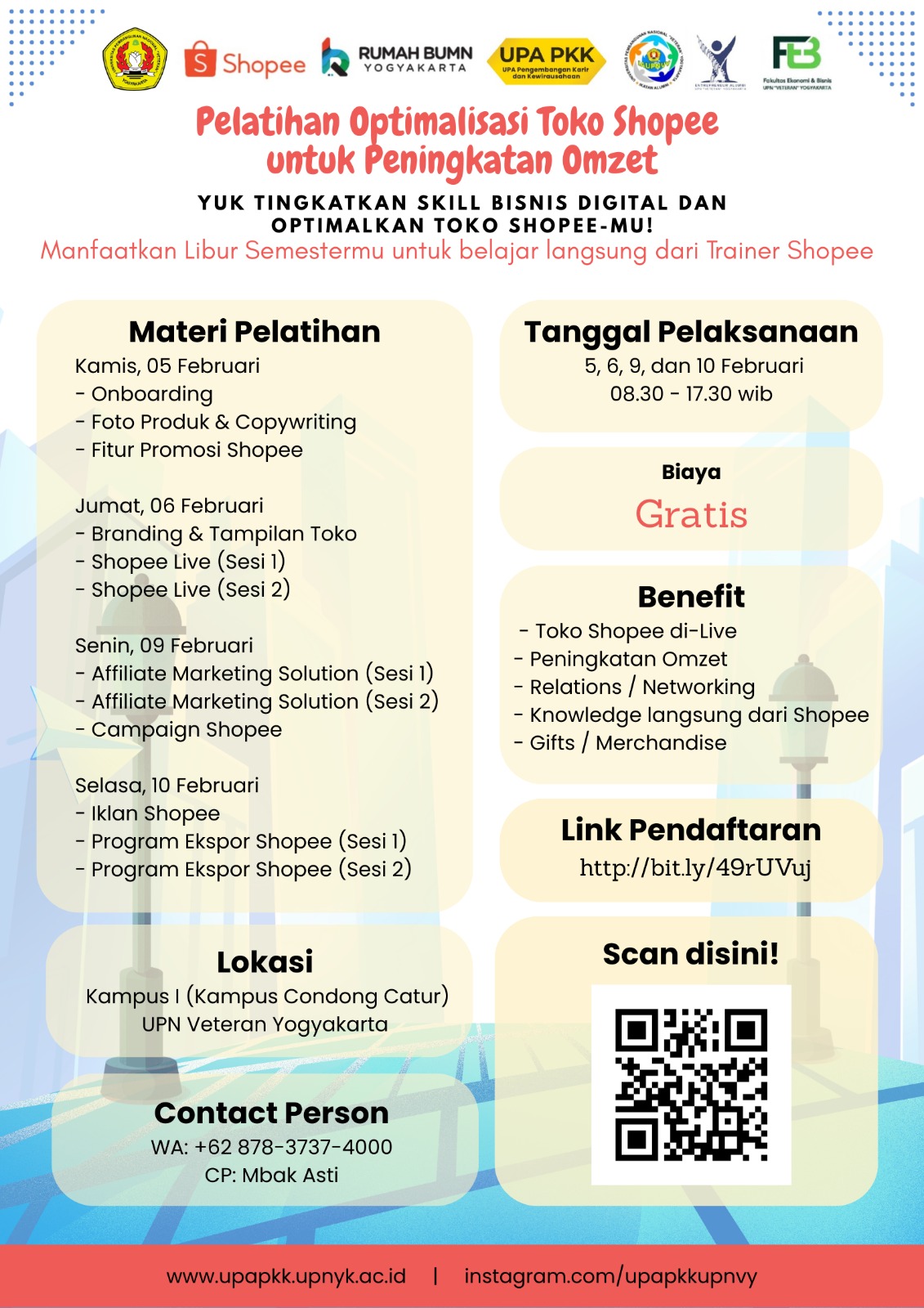 UPA Pengembangan Karir dan Kewirausahaan (UPA PKK) UPN “Veteran” Yogyakarta menyelenggarakan pelatihan kewirausahaan bertema Optimalisasi Toko Shopee untuk Peningkatan Omzet. Kegiatan ini ditujukan bagi mahasiswa, alumni, maupun pelaku usaha pemula yang ingin meningkatkan keterampilan bisnis digital dan mengoptimalkan performa toko di platform Shopee. Peserta akan belajar langsung dari trainer Shopee dengan materi yang aplikatif, mulai dari penguatan tampilan toko, strategi promosi, pemanfaatan fitur Shopee Live, hingga pemahaman iklan dan peluang ekspor. Pelatihan ini cocok bagi peserta yang ingin menaikkan penjualan, memperluas jangkauan pasar, serta membangun jaringan (networking) dengan sesama pelaku bisnis digital.