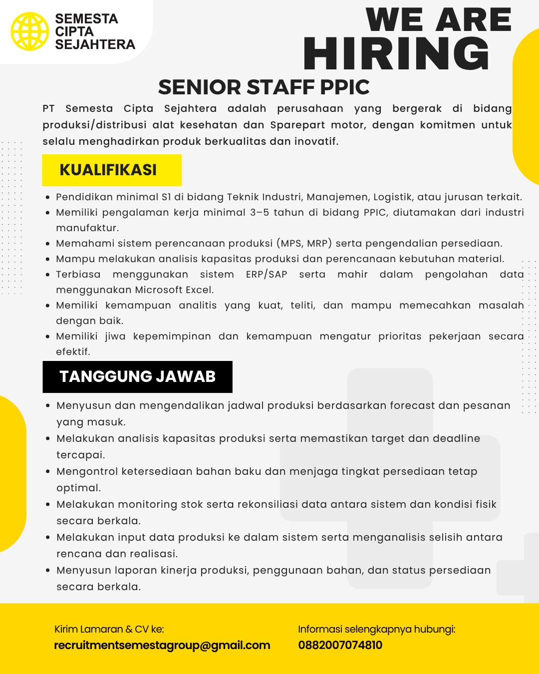 PT Semesta Cipta Sejahtera membuka kesempatan berkarier untuk posisi Senior Staff PPIC. Perusahaan ini bergerak di bidang produksi dan distribusi alat kesehatan serta sparepart motor, dengan komitmen menghadirkan produk yang berkualitas, inovatif, dan sesuai kebutuhan pasar. Posisi ini ditujukan bagi kandidat yang memiliki pengalaman dalam perencanaan produksi, pengendalian persediaan, analisis kapasitas, serta pengelolaan data produksi secara akurat.