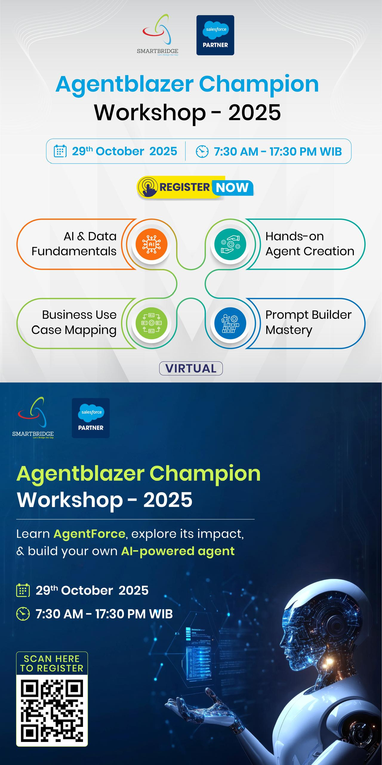 Smartbridge, sebagai Salesforce Partner, menghadirkan Agentblazer Champion Workshop 2025, sebuah pelatihan intensif untuk mempelajari dan membangun agen berbasis kecerdasan buatan. Workshop ini akan diselenggarakan secara virtual pada 29 Oktober 2025, mulai pukul 07.30 hingga 17.30 WIB.