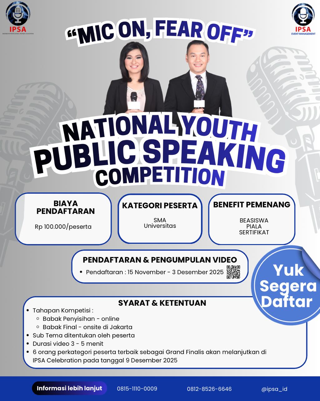 UPN "Veteran" Yogyakarta mengajak seluruh mahasiswa untuk berpartisipasi dalam ajang bergengsi tingkat nasional National Youth Public Speaking Competition 2025 dengan tema "Mic On, Fear Off". Kompetisi ini menjadi kesempatan bagi mahasiswa untuk menunjukkan kemampuan berbicara di depan publik serta menorehkan prestasi di tingkat nasional.