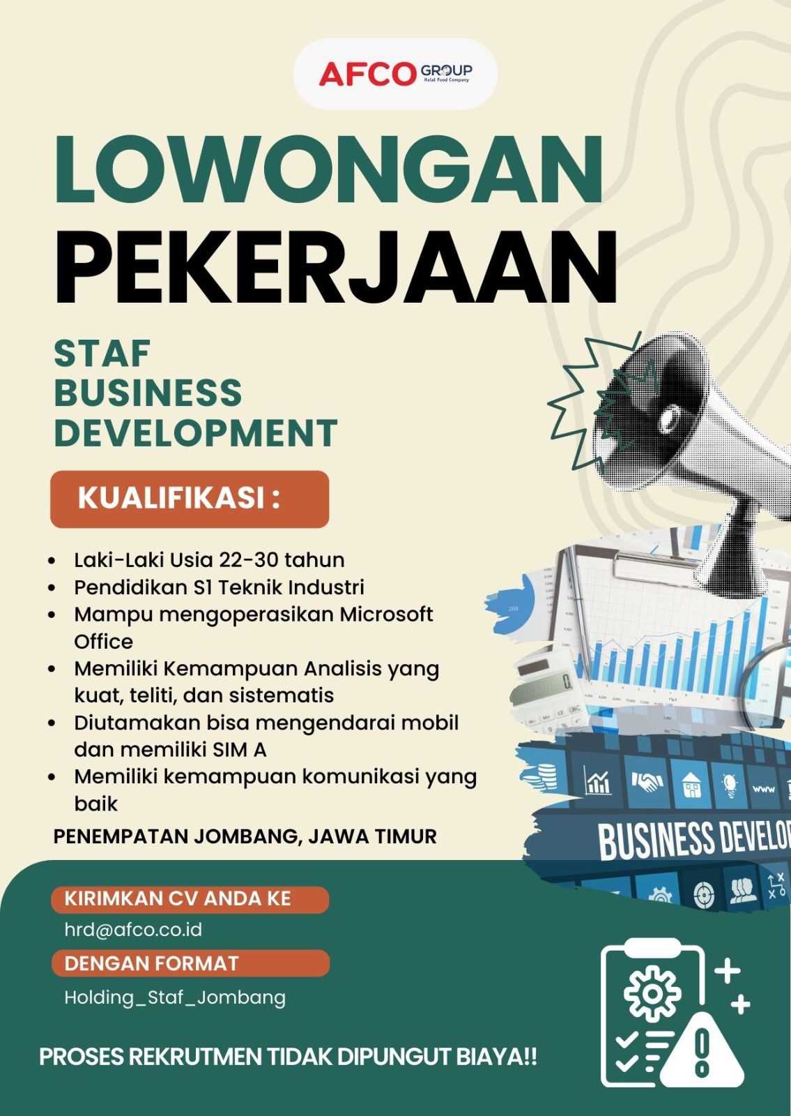 AFCO Group (Kediri Food Company) membuka lowongan untuk posisi Staf Business Development penempatan Jombang, Jawa Timur. Kami mencari talenta yang teliti, analitis, dan komunikatif untuk mengembangkan pasar, memperkuat kemitraan, serta mendorong pertumbuhan bisnis. Peran ini menuntut kemampuan olah data, penyusunan laporan, dan kolaborasi lintas tim agar inisiatif pengembangan berjalan efektif dan terukur.